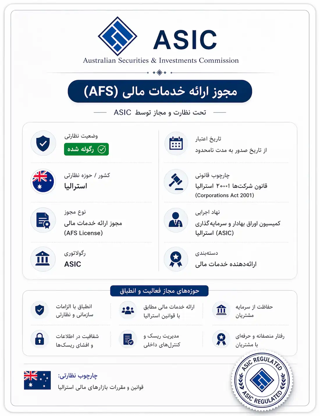 | ASIC | Australia | Advisory License (Non-Trading) – Tier 1 Framework | 402043 | متوسط (به دلیل عدم پوشش مستقیم معاملات) |