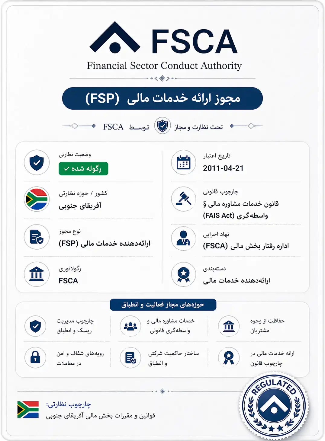 OPO Finance (PTY) LTD تحت نظارت FSCA بهعنوان یک Financial Services Provider (FSP) فعالیت میکند. این رگولاتور بر رعایت قوانین مالی، مدیریت ریسک و حفاظت از سرمایه مشتریان نظارت دارد و در سطح متوسط رو به بالا قرار میگیرد.