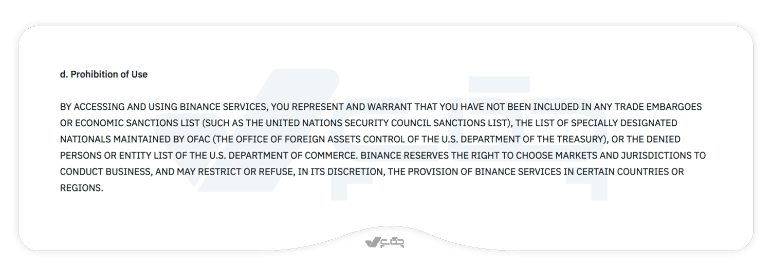 یکی از چالشهای اصلی کاربران ایرانی، تحریمهای بینالمللی است. طبق مقررات موجود، کاربران ایرانی مجاز به استفاده از خدمات بایننس به صورت رسمی نمیباشند. برخی از تغییرات اخیر در قوانین و مقررات بایننس بهطور مستقیم به محدودیتهای دسترسی کاربران ایرانی اشاره دارد؛ بنابراین توصیه میشود کاربران ایرانی از ایجاد حساب و احراز هویت در بایننس خودداری کنند تا از بروز مشکلات قانونی جلوگیری شود.
