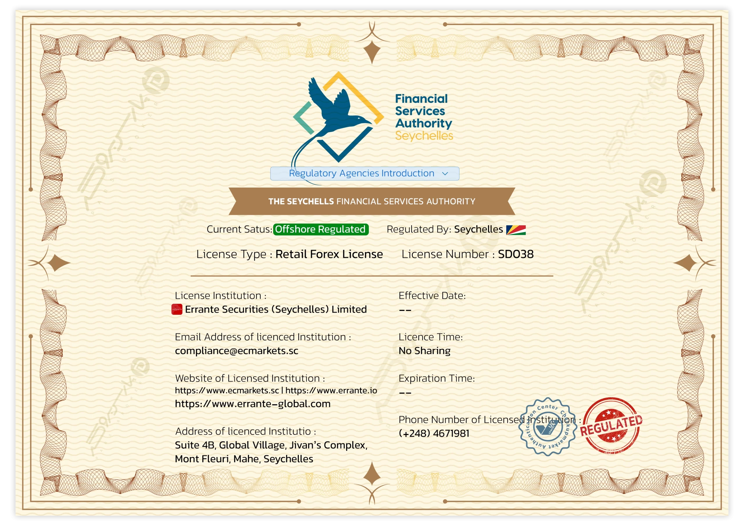 هرچند FSA در رده رگولاتورهای سطح پایین‌تر (Tier 3) قرار دارد و نسبت به نهادهایی مانند ASIC یا FCA نظارت سخت‌گیرانه‌ای اعمال نمی‌کند، اما به بروکرهایی نظیر Errante امکان ارائه خدمات بین‌المللی با انعطاف بیشتر را می‌دهد. این نوع رگوله معمولاً برای جذب مشتریان از کشورهای فاقد رگولاتوری قوی یا تحریم‌شده مورد استفاده قرار می‌گیرد.